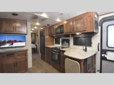 This dual entry travel trailer will be perfect for your trips to the mountains. The rear mountain dinette includes a large window for outdoor views, and you'll find additional seating space on the sleeper sofa. The chef of your group can work up their magic in the full kitchen that includes a sunken range and a flip-up counter for more counter space. Within the front private bedroom you'll find a queen bed, wardrobes on either side of the bed, plus a wardrobe slide for more space and storage.