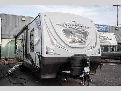 The Titanium Series models include a silver fiberglass front cap, frameless thermal pane windows for a more sleek look, and ground control TT auto leveling system for hassle-free set up. Head indoors to find hardwood throughout and all leather design, hardwood slide out fascia(s), and LG solid surface countertops. You'll be comforted each night by the premium memory foam mattress and mountain luxury bedding, and each model includes a mountain lodge bathroom with plenty of comforts and conveniences.