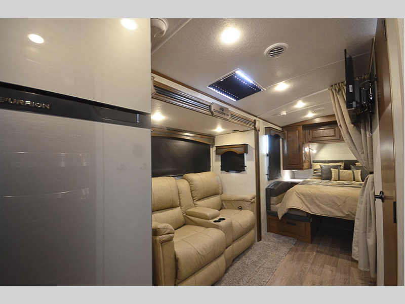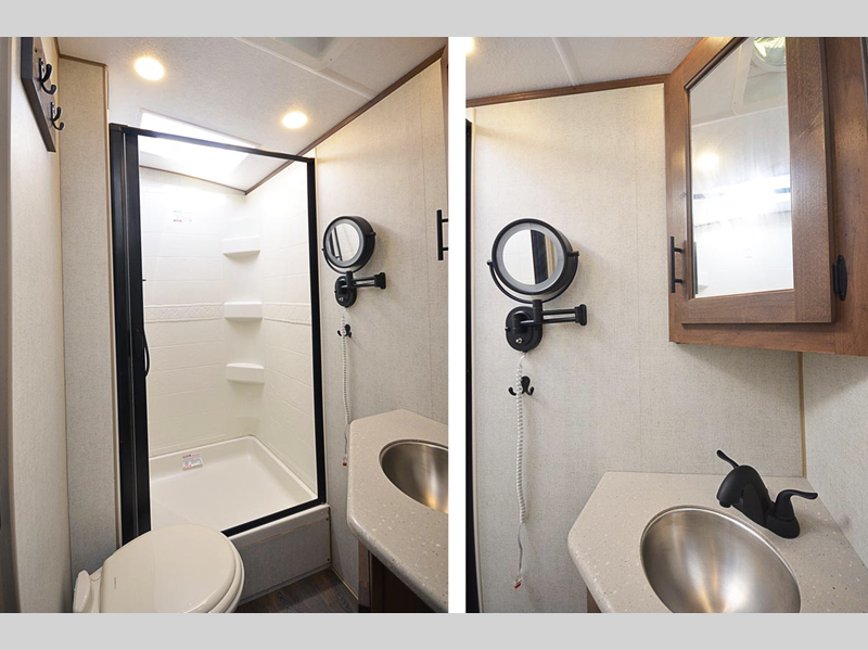 Each model features a Lamilux HD 4000 high gloss silver fiberglass, sleek design frameless thermal pane windows, and chrome door locks for that added touch of luxury. You will love the LG solid surface countertops, mountain lodge interiors with hardwood throughout, and privacy blackout roller shades.